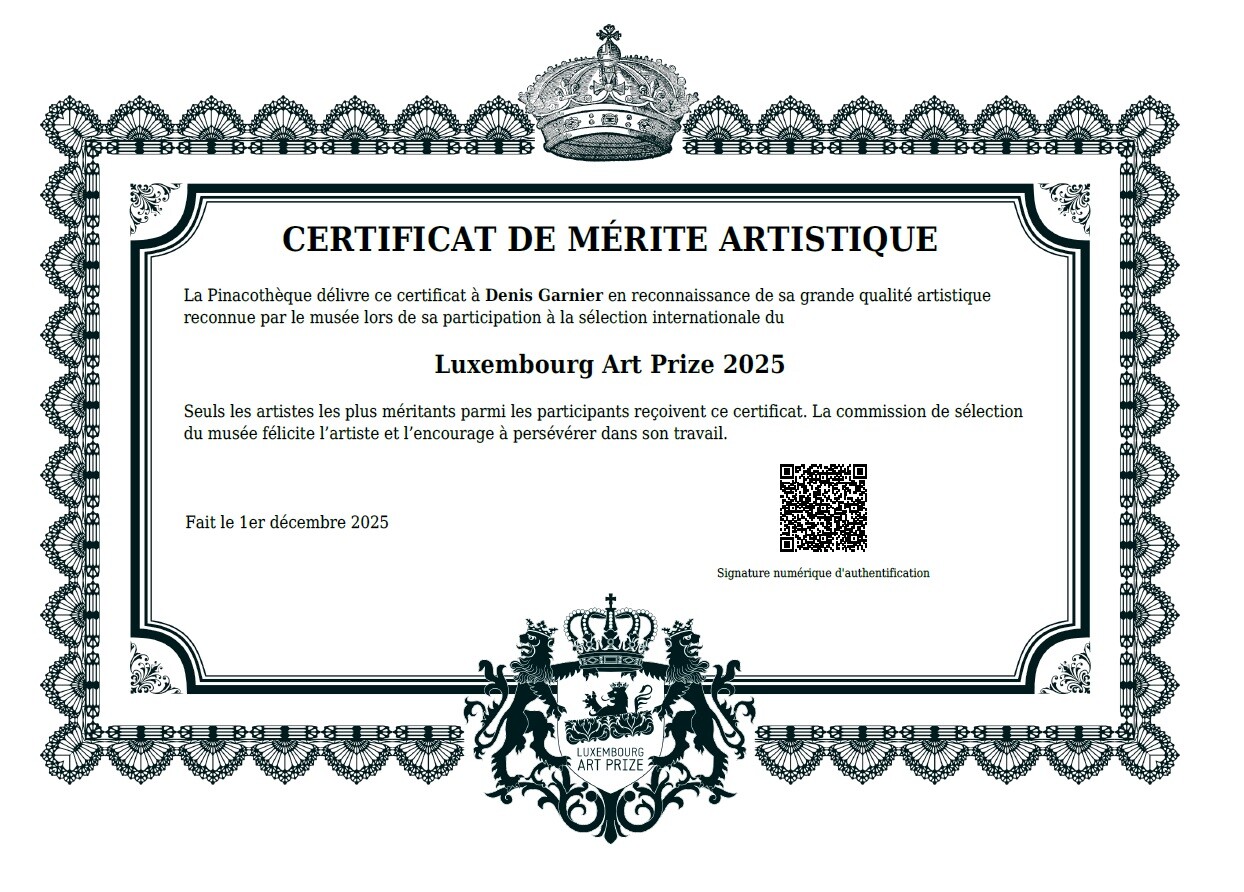 Voir le prix Le musée délivre à tous les artistes remarqués d’un point de vue qualitatif un certificat nominatif de mérite artistique correspondant à l’année de participation, qu’ils soient finalistes ou non. Ce certificat peut être obtenu en 9 langues différentes. Le certificat a pour objectif d’apporter une reconnaissance officielle d’un musée aux artistes participants dont le mérite et le talent artistique ont été particulièrement remarqués.